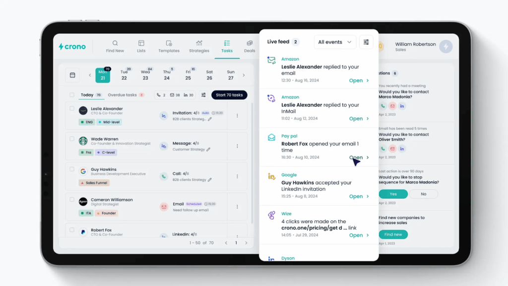 With Crono’s Chrome extension, you don’t have to wait until you log into your CRM or the Crono platform to create or execute sales tasks. You can do it as you scroll through LinkedIn.