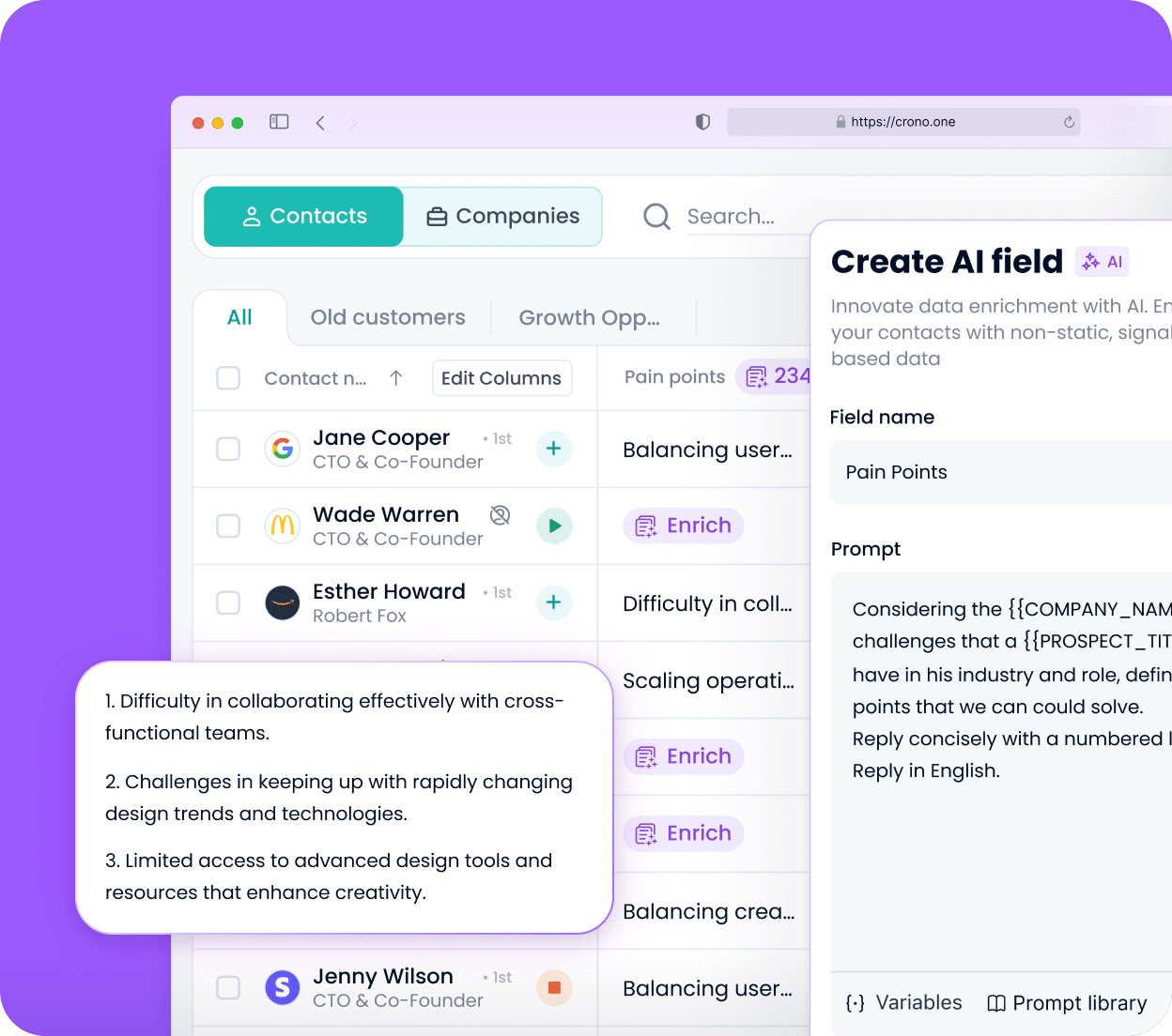 Create custom fields to collect all the data that matters to your business and map them directly to your CRM. Crono ensures nothing gets lost, overwritten or misused during execution.